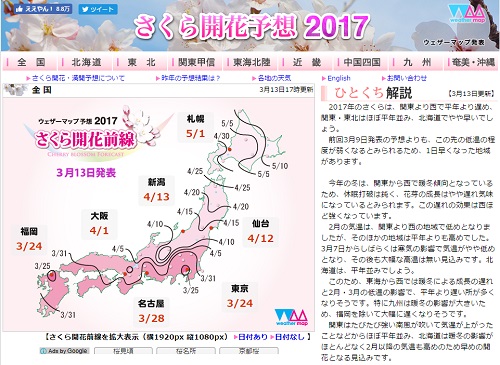 2017年の関東地方の開花予想日はほぼ平年並みということで、最も早いのが東京で、3月24日(金)に開花、4月2日(日)に満開の予想となっています。